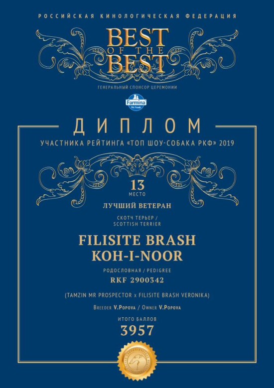 ТОП СОБАКА # 13, ТОП ВЕТЕРАН # 1 - 2019 - Filisite Brash KOH-I-NOOR